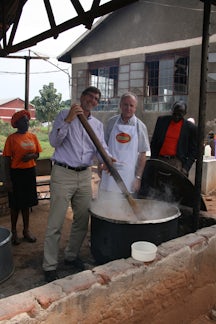 Iverson, Hershey and Nsubuga stir up 14 kilos of TSP to feed 800 high school students at a local boarding school run by the Adventist Church.